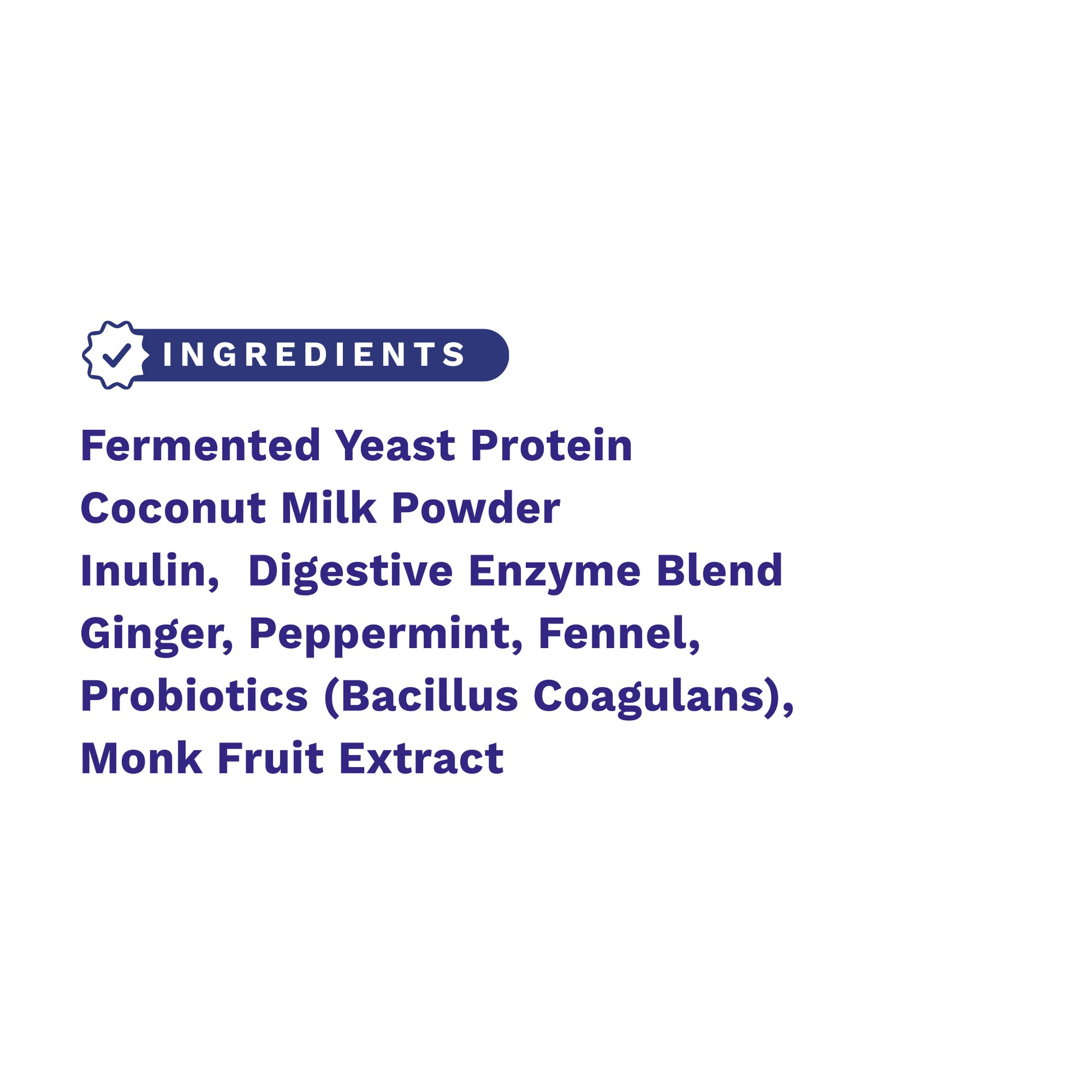 A concentrated protein made through fermentation, built for daily use. You get digestive enzymes, probiotics (Bacillus coagulans), inulin, and herbs like ginger, peppermint, and fennel — all working together to support better digestion and avoid the heavy, bloated feeling most proteins create.