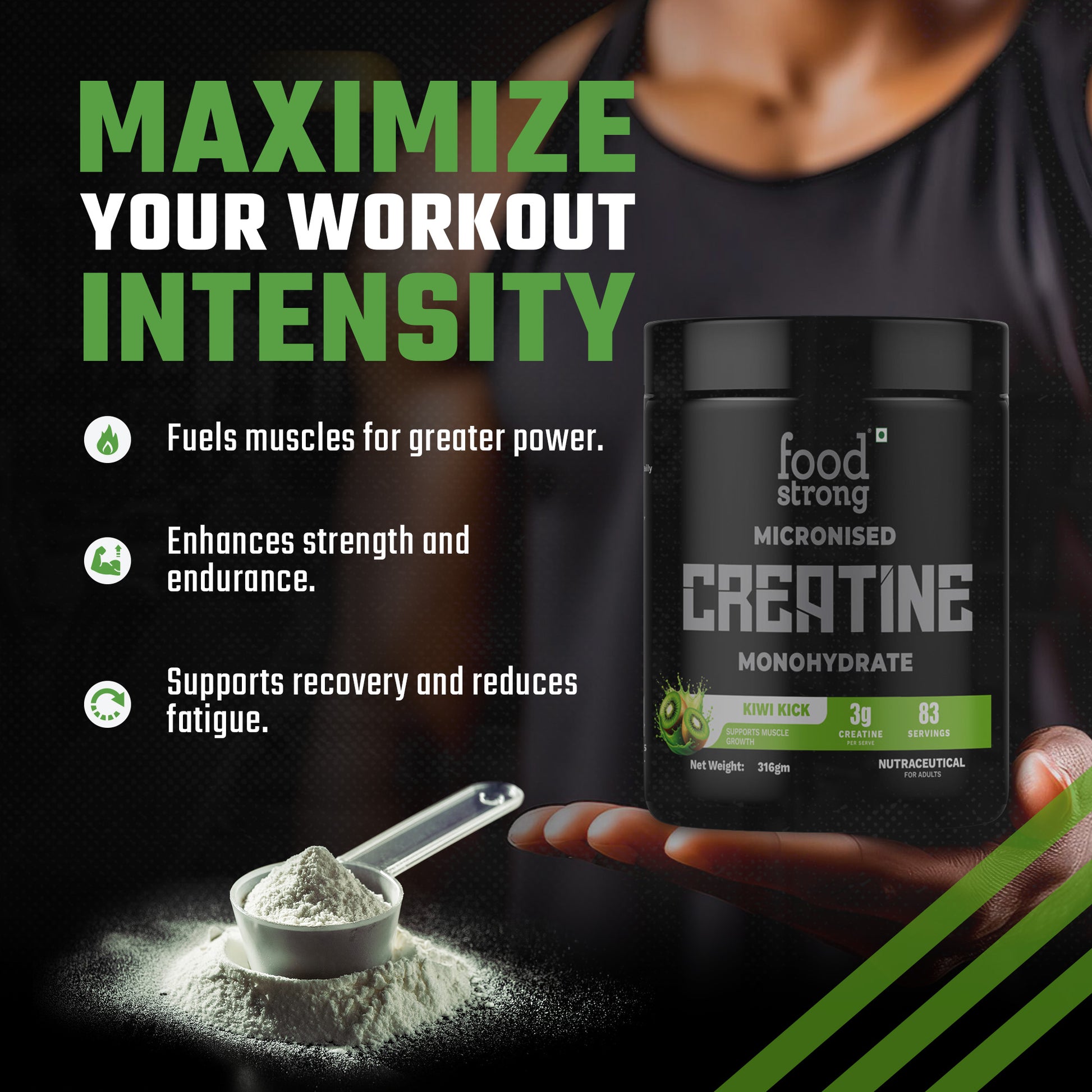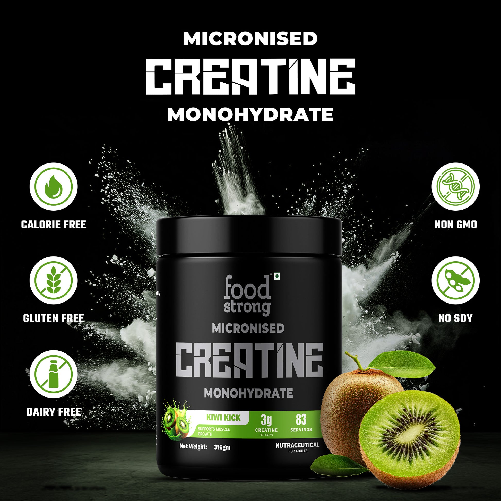 Foodstrong Micronised Creatine Monohydrate 316gm | Kiwi Kick Flavor