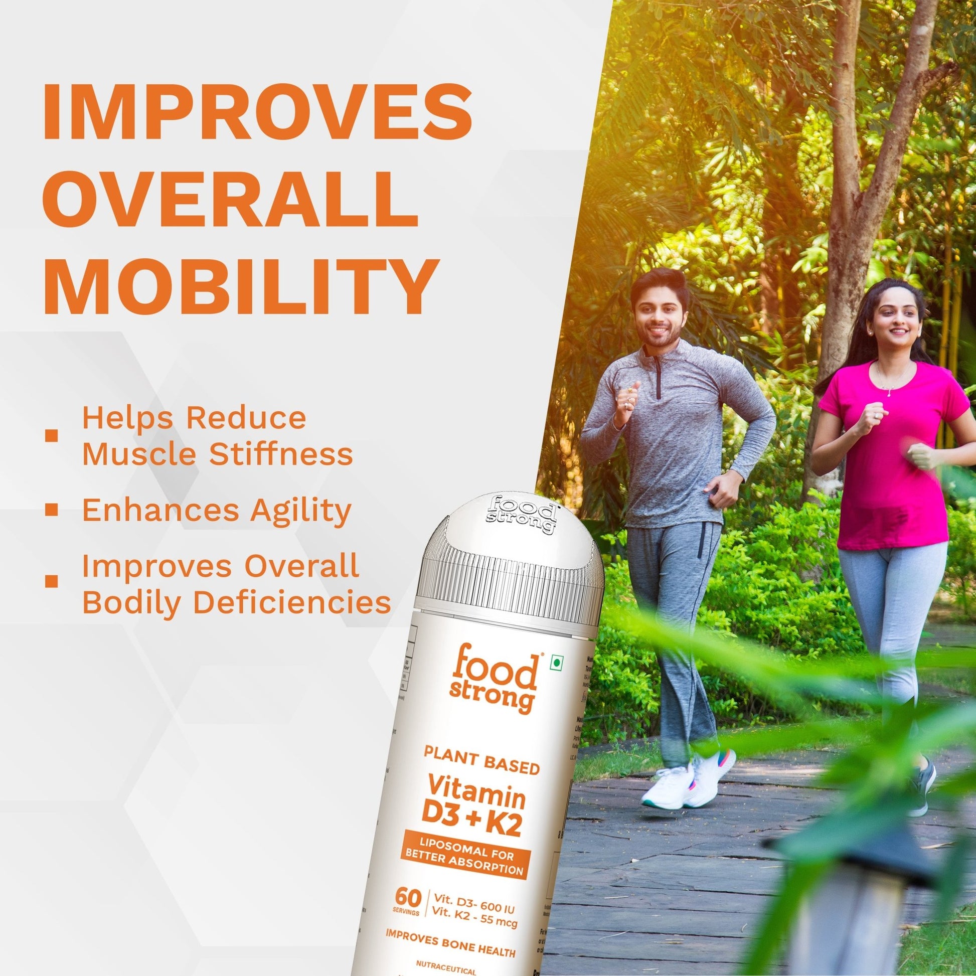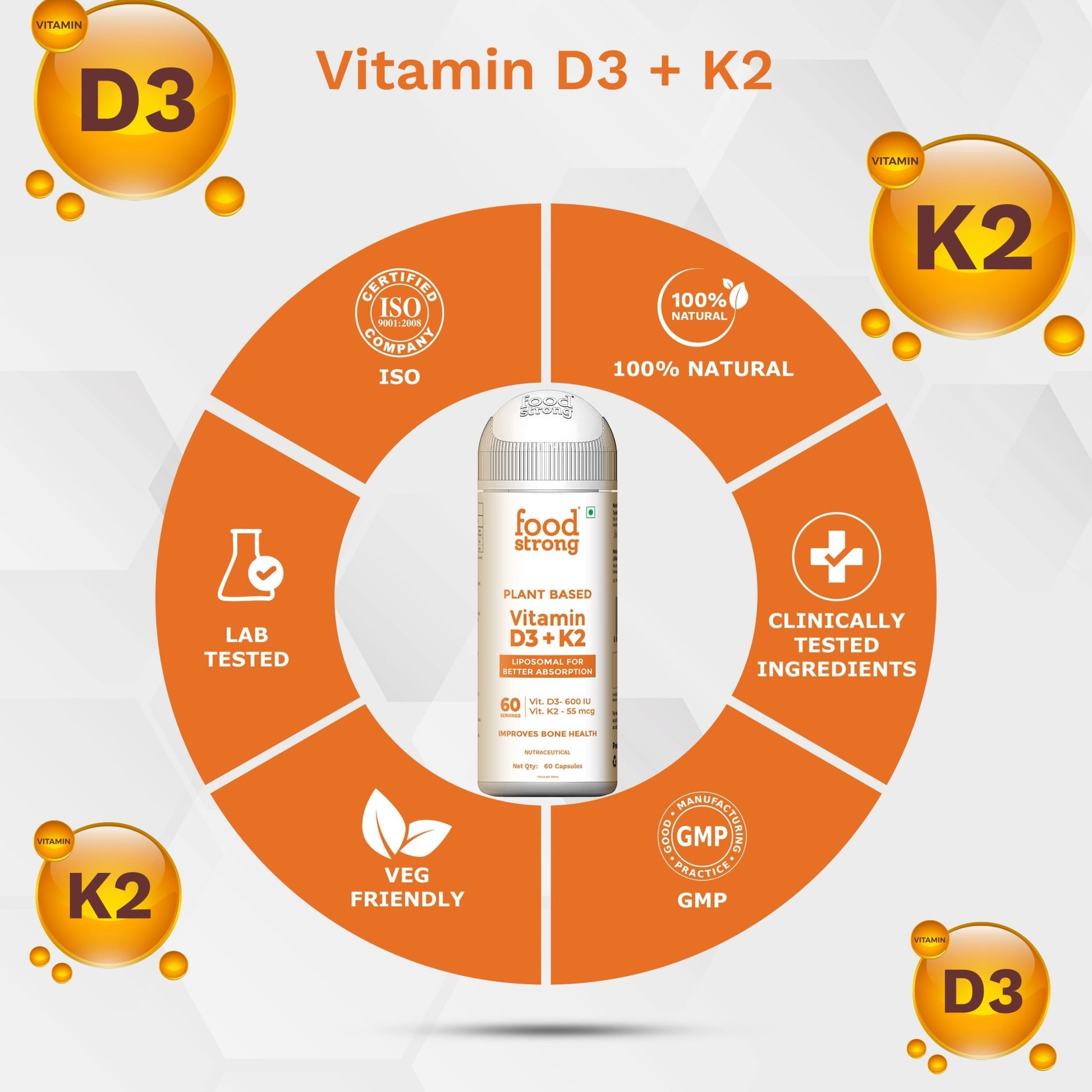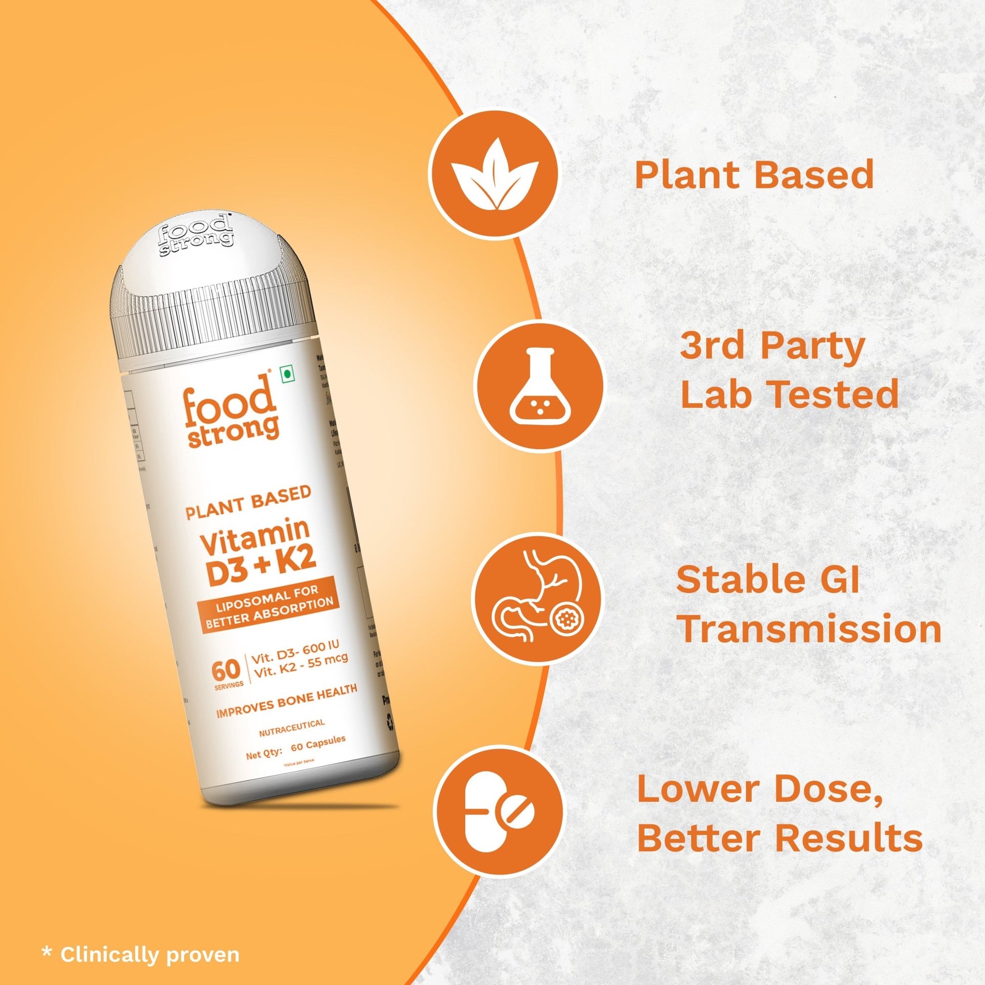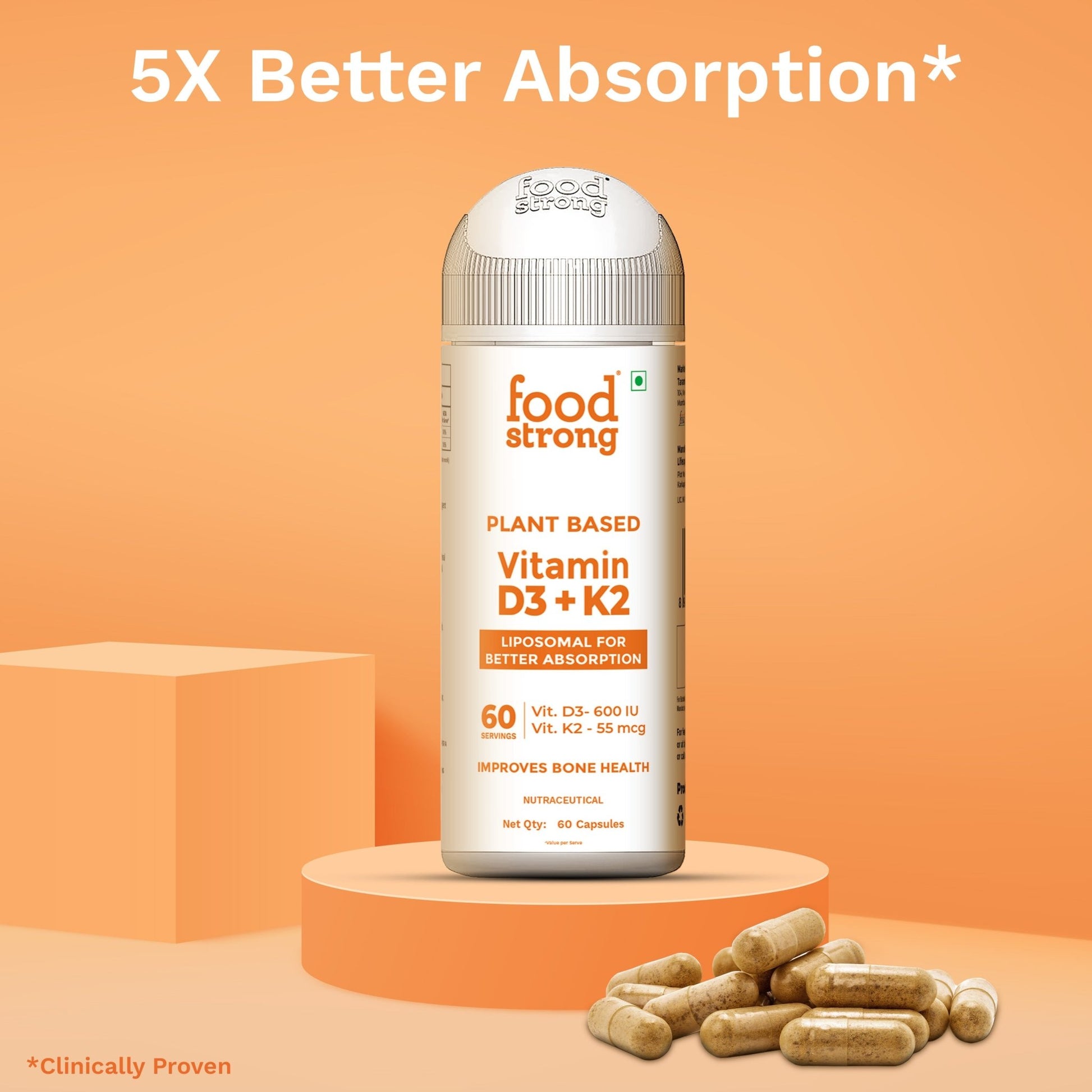 Foodstrong Plant-Based Vitamin D3 + K2 capsules are formulated for optimal bone and immune health. Using Liposomal technology, these nutrients are delivered in a form that the body absorbs more efficiently.