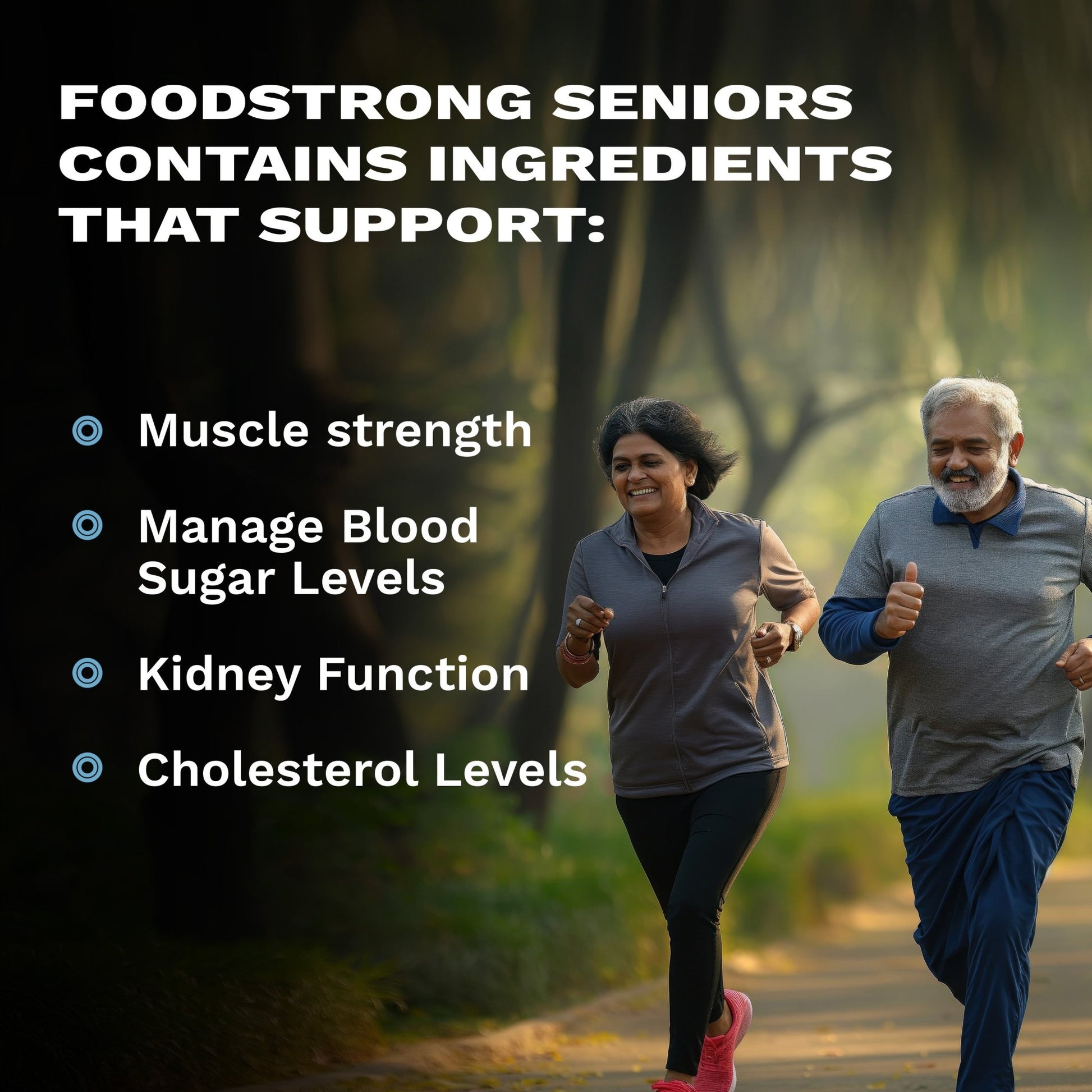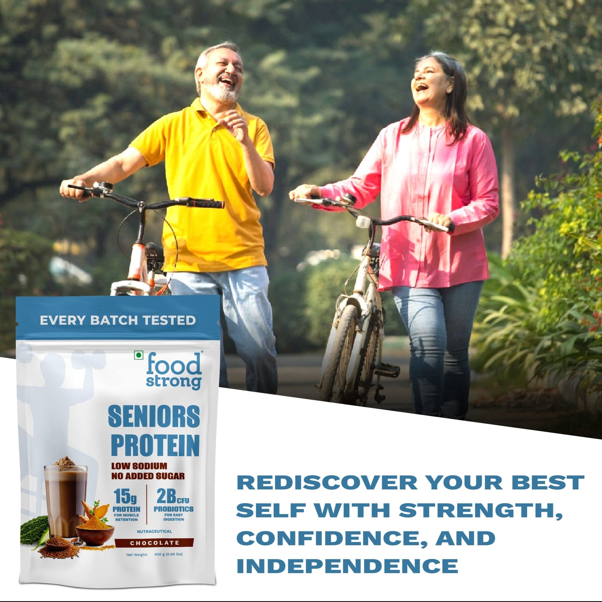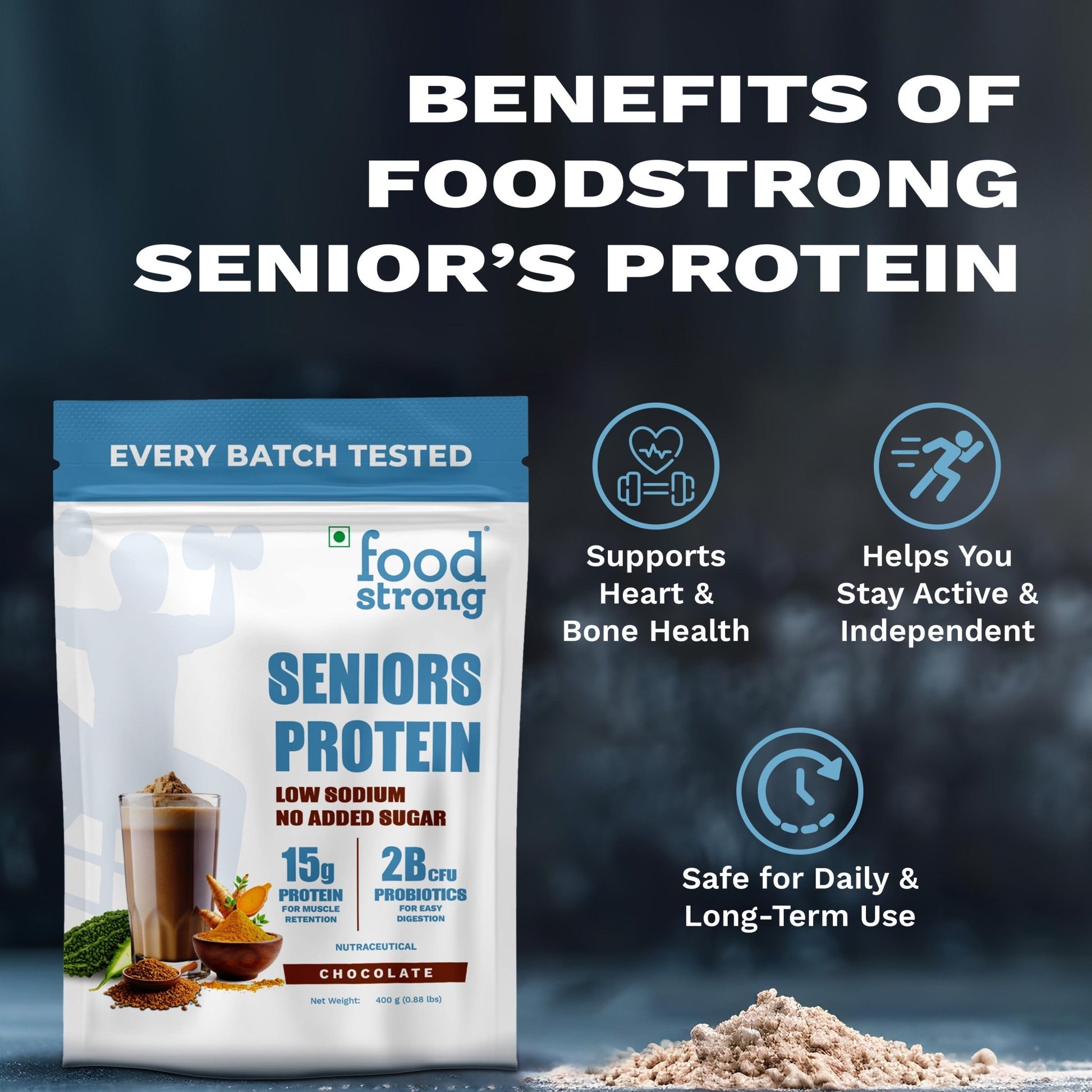 Each scoop of Foodstrong Seniors Protein is science-built for senior vitality, fueled by a blend of functional proteins, Indian botanicals, and clean, daily nutrition.