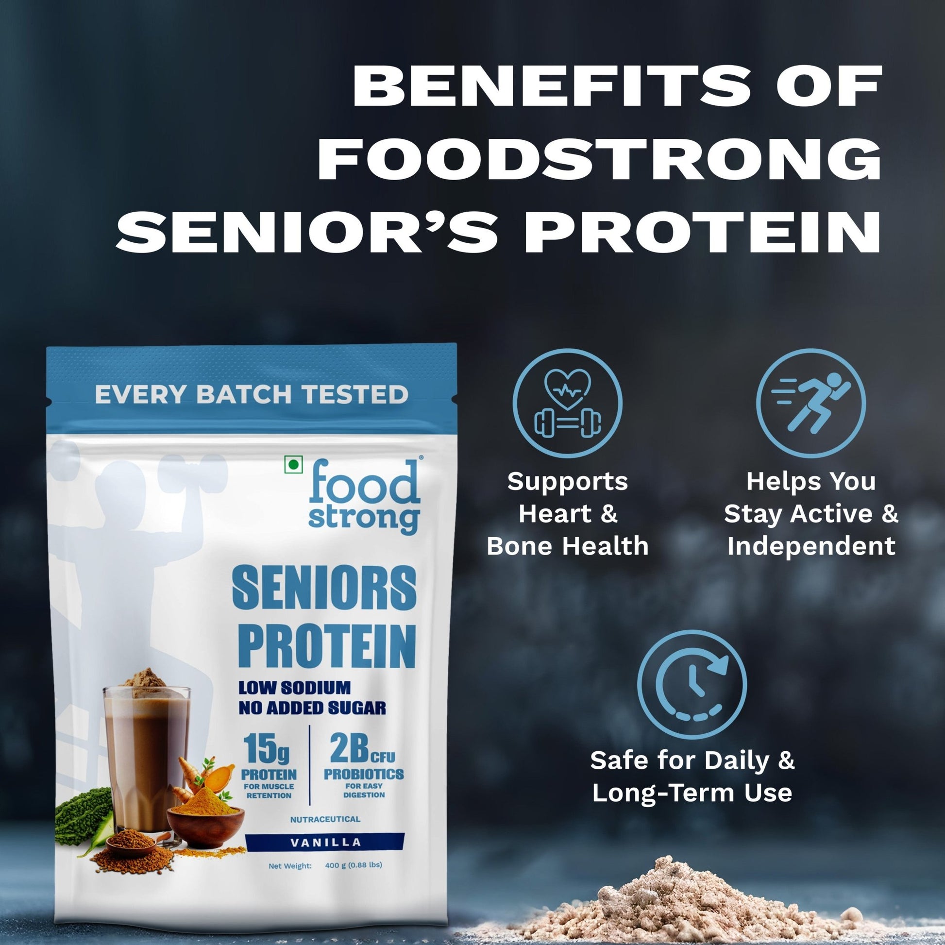 Foodstrong Seniors Protein brings together 15g of clean protein, gut-friendly probiotics, and the best of nature’s wisdom to support muscle strength, stable sugar, kidney wellness, and cholesterol management—all in a delicious vanilla glass.