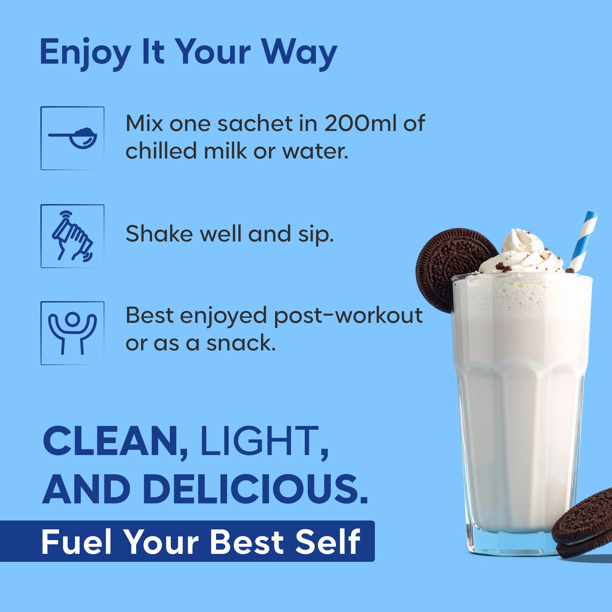 Enjoy protein in convenient single-serve sachets – no measuring, no weighing, just rip, mix, and enjoy!