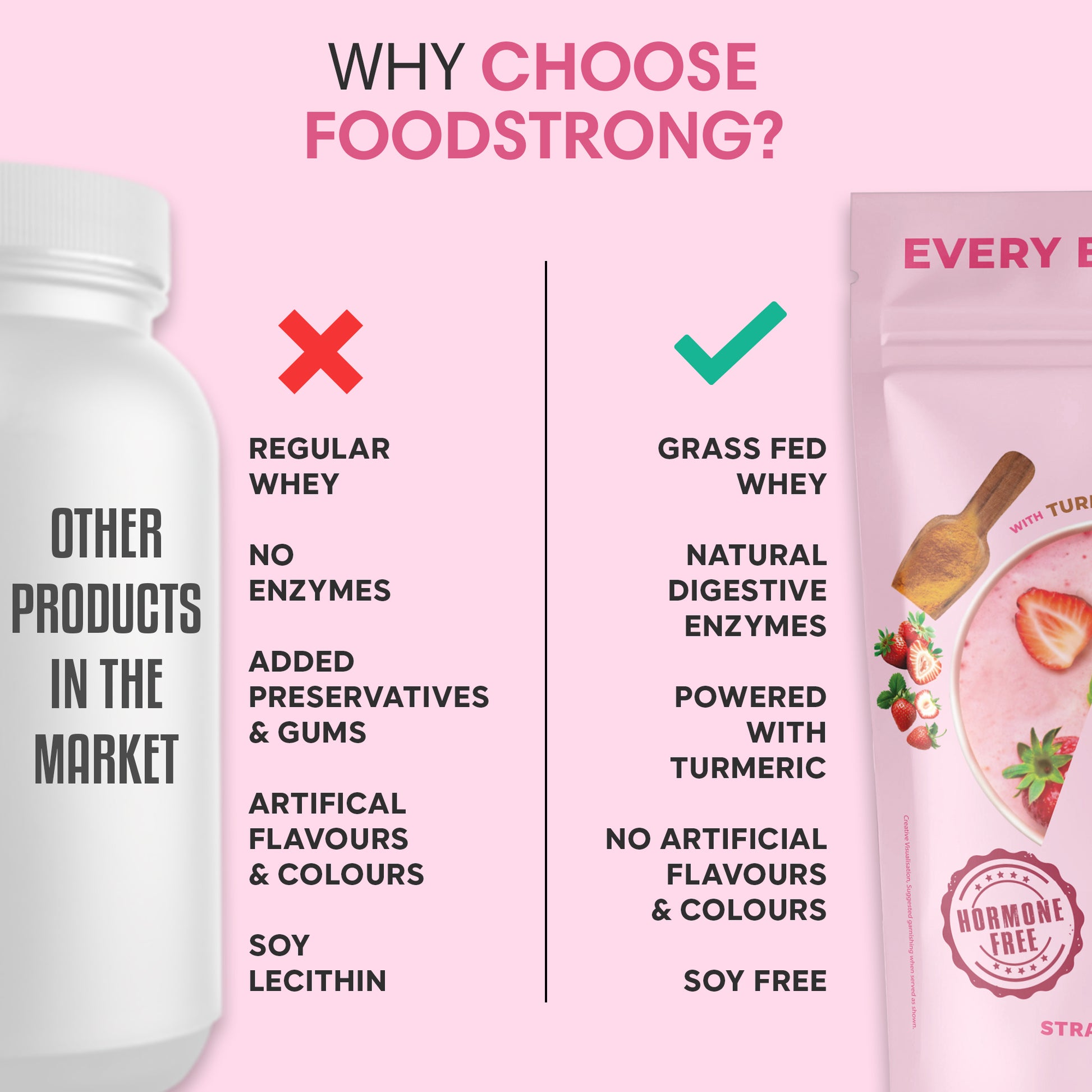 Level up your routine with Foodstrong’s Strawberry Whey Protein turns the joy of real fruit into pure, bloat-free muscle fuel.